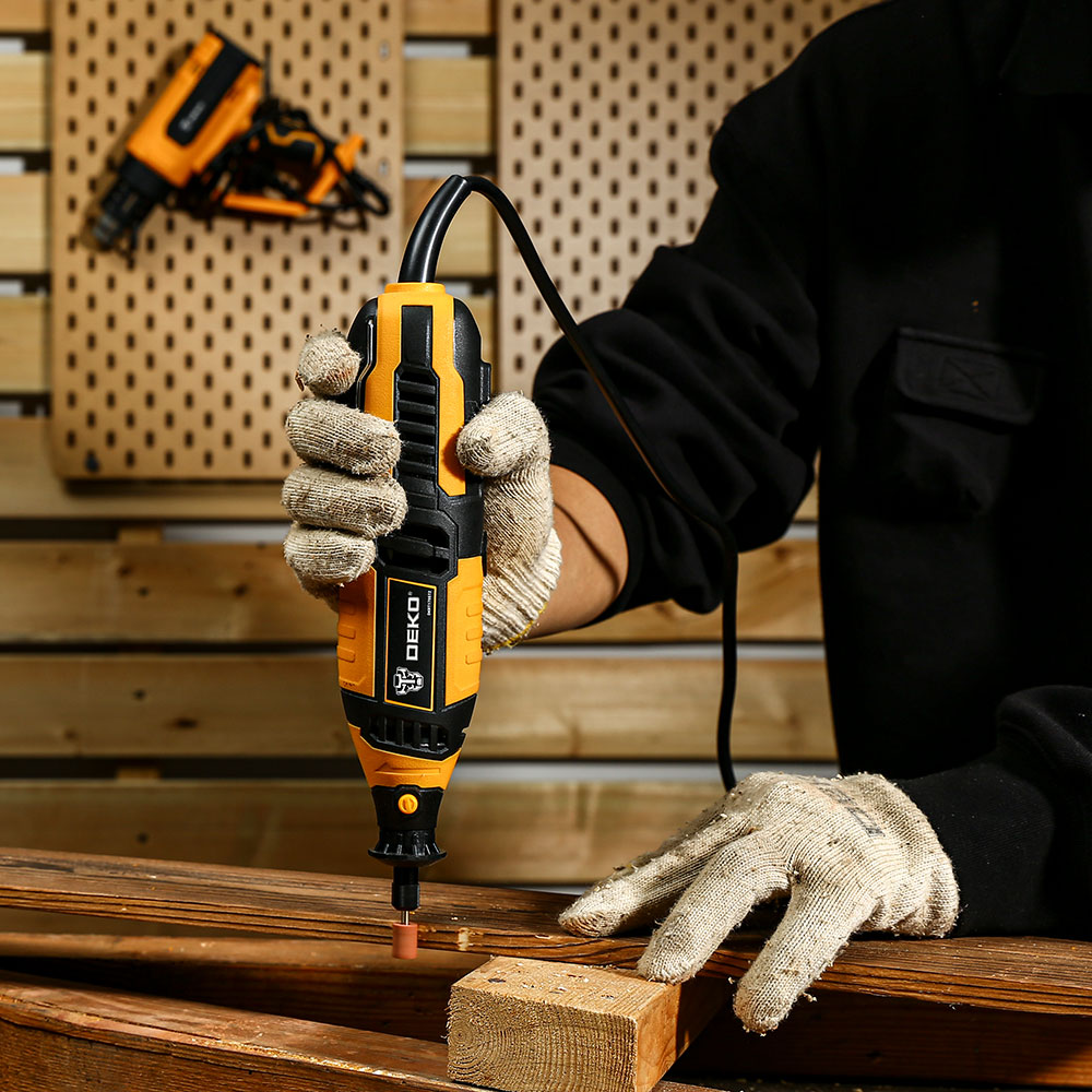 Micro Retífica Deko-DKRT170ST permite a realização de inúmeras atividades, manuseio perfeito nas aplicações mais exigentes utilizando suas pontas montadas e acessórios específicos. Ferramenta multifuncional, a precisão nos cortes, qualidade nos acabamentos, facilidade nas perfurações, rendimento ao polir e gravar. Torna a Micro Retífica essencial para sua caixa de ferramentas. Ideal para profissionais de Oficinas, serralherias, indústrias, ferramenteiros, entre outros. A Micro retífica Deko-DKRT170ST possui potência de 170W e velocidade variável de 10.000 a 36.000 rpm e equipada com pinça metálica de 3,2mm - (1/8"). Micro retífica permite a realização de inúmeras atividades utilizando os acessórios adequados. Ferramenta multifuncional capaz de cortar, perfurar, polir, moer, areia e gravar.