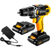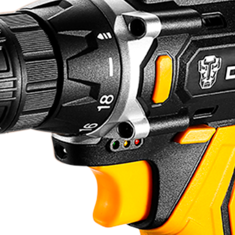 A Parafusadeira Furadeira sem Fio possui velocidade variável, mandril sem chave, luz de trabalho LED que auxilia a operação em locais com pouca iluminação, e conta com 18+1 configurações de torque.