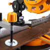 Possui base giratória para cortes em ângulo de 45° para ambos os lados, braço (cabeça de corte) com botão para regulagem de inclinação de até 45° para a esquerda, cabo com revestimento emborrachado, eixo com flange adaptadora que permite a utilização de lâminas e protetor de lâmina. Morsa e apoios laterais que facilitam o corte em peças de maior comprimento. Equipamento multifuncional, pois pode cortar madeira e alumínio. Indicada para cortar madeiras beneficiadas e derivados (não acompanha), também pode cortar cantoneiras e esquadrias de alumínio em operações leves e médias.